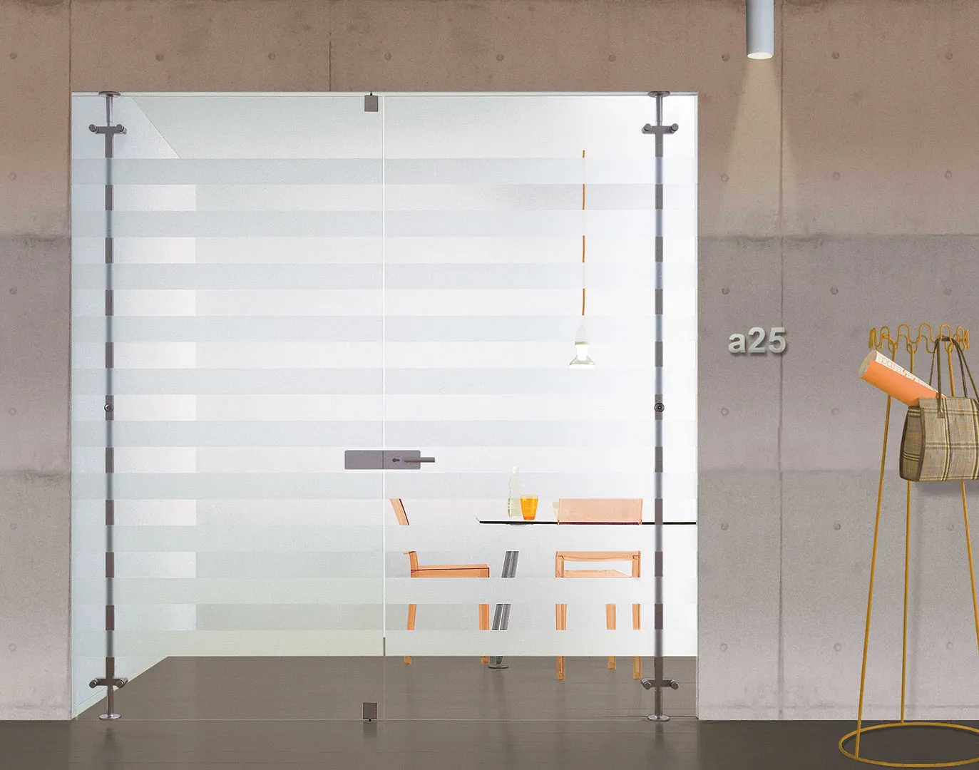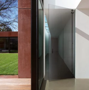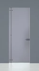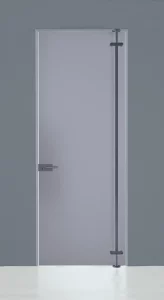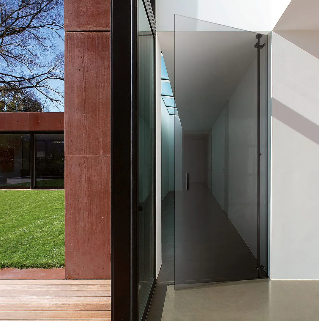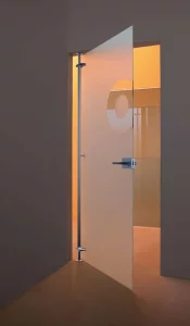 Systeem van 8 mm dikke geharde glazen draaideuren die draaien, ondersteund door aluminium staanders die verankerd zijn aan de vloer en het plafond. Verkrijgbaar in uitvoeringen met één of twee deuren, met verschillende soorten handgrepen en sloten.